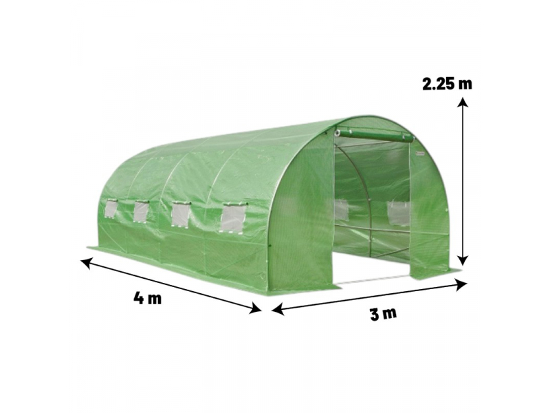Datorită dimensiunilor practice de 4 m lungime, 3 m lățime și 2.25 m înălțime, sera se potrivește perfect în curți mici, grădini de familie sau terenuri înguste. Cele două intrări, ferestrele de aerisire de pe ambele părți și plasa de aerisire permit controlul eficient al ventilației și protecția împotriva insectelor. Structura este completată de distanța uniformă între arcuri de 1 metru, ceea ce asigură un montaj stabil și o durată lungă de viață.